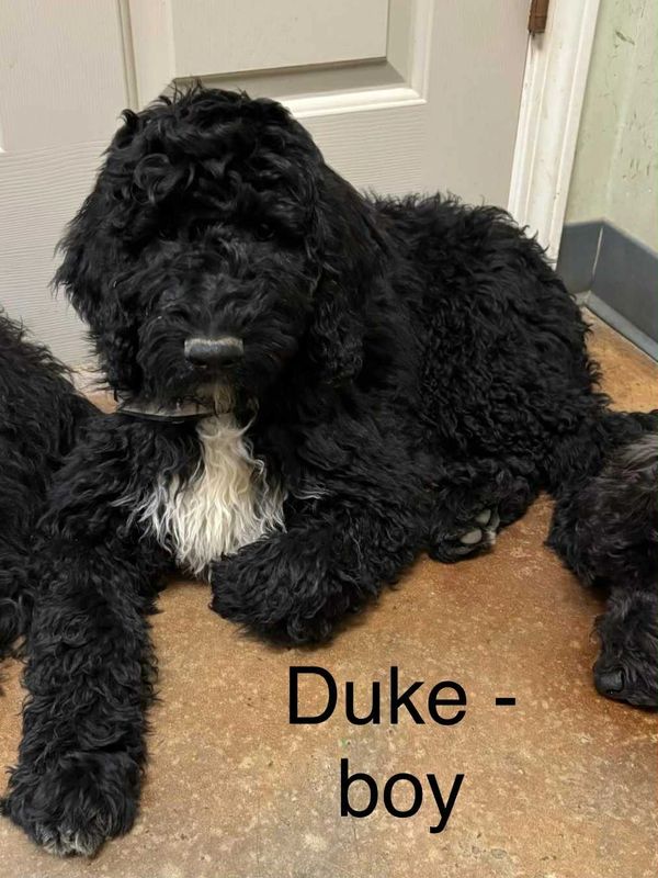 Duke is a f1bb goldendoodle. He has a black coat with a white on chest and white tipped toes. He is very sweet and loving. He loves being with his people. He is doing wonderful with his training.