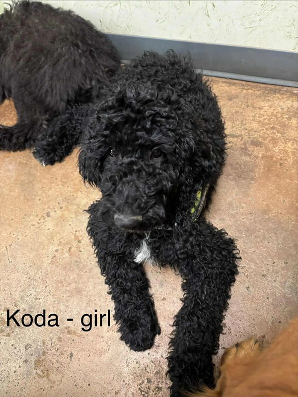 Koda is a f1bb goldendoodle. She has a black coat with a white on chest and white tipped toes, and white on chin. She is a very sweet girl. She is strong willed, but is doing wonderful with training.