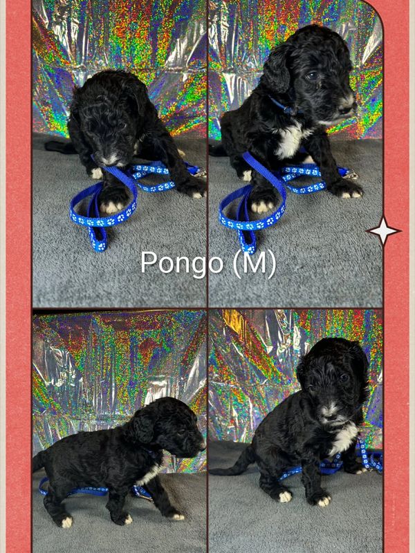 Deimos and Jupiter had 9 puppies. These are considered standard multigenerational goldendoodle, they are about 80-90% poodle and 10-20% golden retriever. there are 6 with mostly black coats with white spots on toe face, and some white tipped tails. 3 are white with black spots, these are considered parti. they will be about 45-75 pounds full grown. There are two reservations on this litter. Message us to find out how to reserve your new family member.