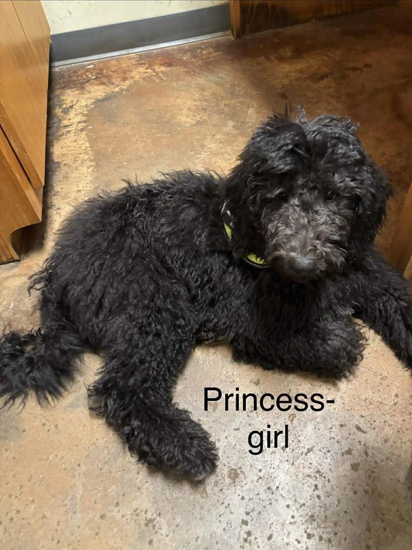 Princess is a f1bb goldendoodle. She has a black coat with a white on chest and white tipped toes. She is very cuddly. She will cuddle with you as long as you let her. She is doing great with all of her training.